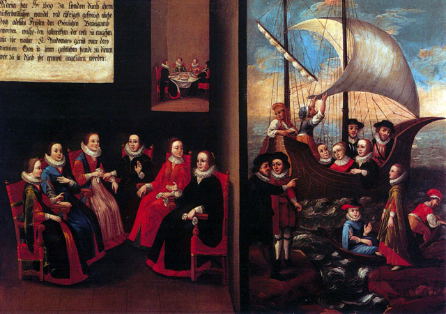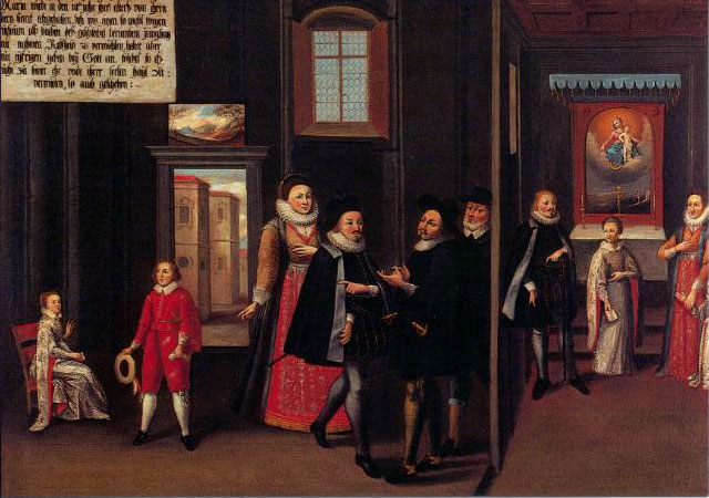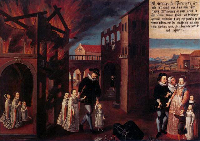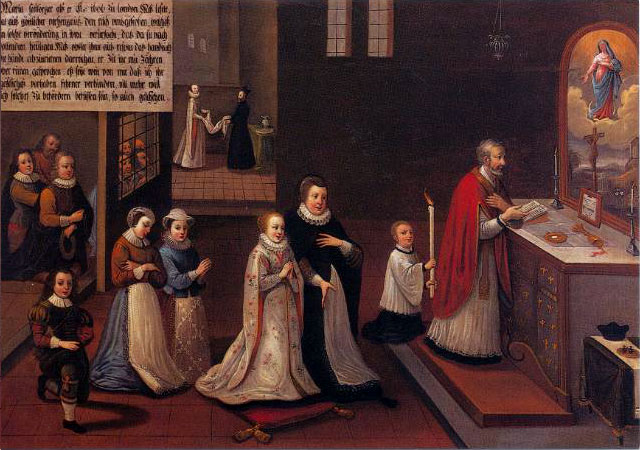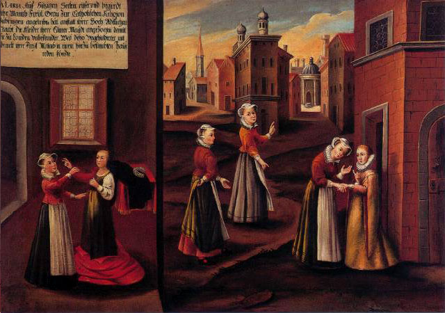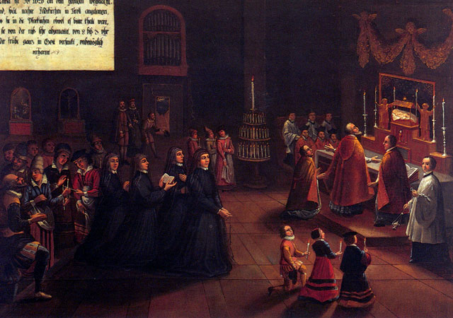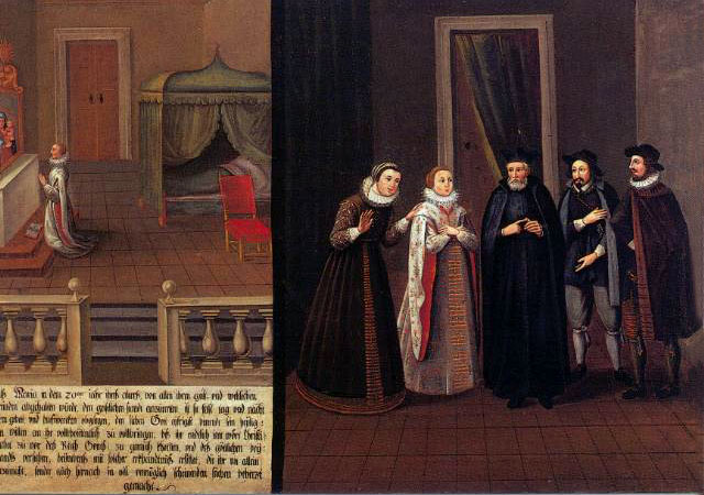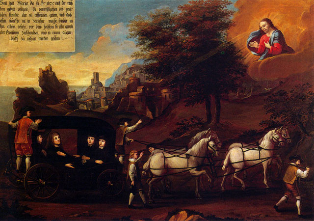 The initiative to commission the paintings must have come from Mary Ward’s first companions as the paintings tell the story of her life in considerable detail. Writing her life would have been risky as Mary Ward’s institute had been condemned by the Church. Commissioning a series of paintings that told the story diminished the risk of ecclesiastical censure – though not entirely. At various times the local bishop ordered their removal from the walls of the Augsburg convent. During the Second World War the paintings were removed and hidden, and therefore survived the destruction of the Augsburg convent.