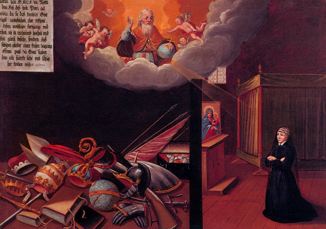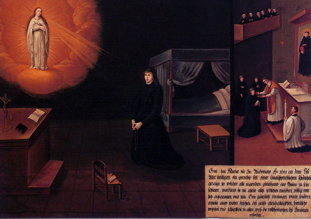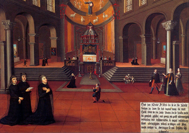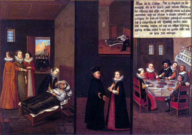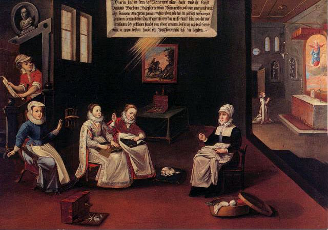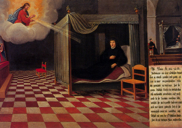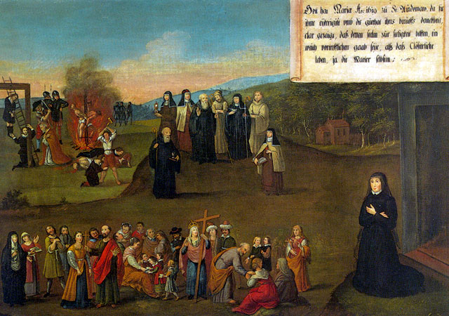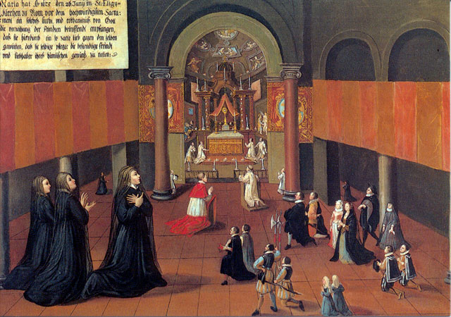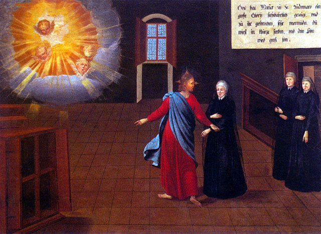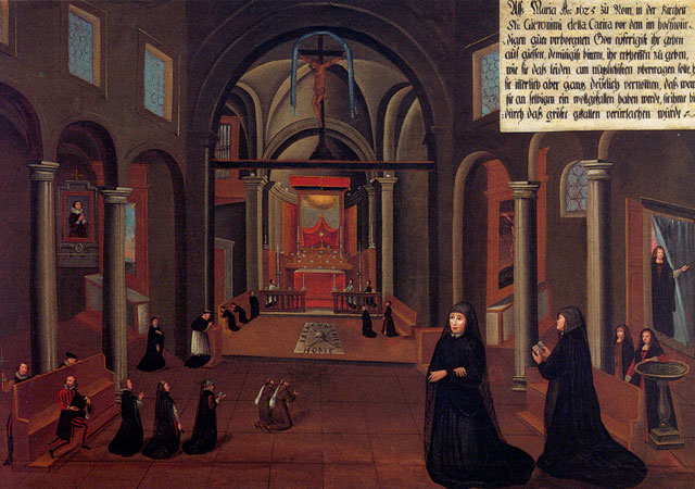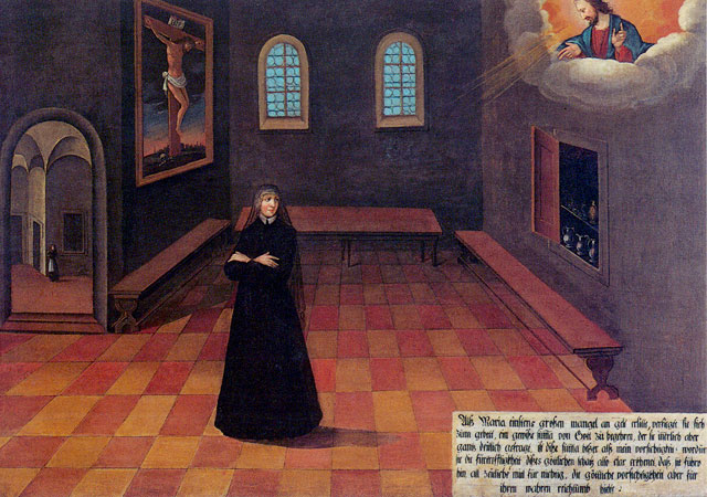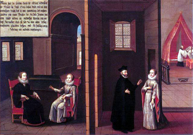 There are fifty paintings, each 142 x 105 cm, known as the ‘Painted Life of Mary Ward’ that show her spiritual journey. They are displayed in the ‘Mary Ward Hall’ in Augsburg in Germany. Very little information has come down to us as to the origins of the paintings. It is most probable that they were painted by various artists somewhere between Flanders and the Tyrol in the second half of the seventeenth century. There is written evidence that places them in Munich between 1680 and 1717, but how they came to Augsburg is unknown.