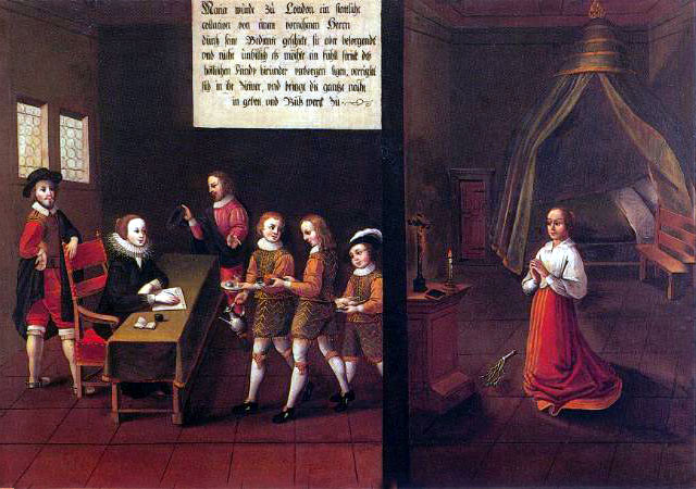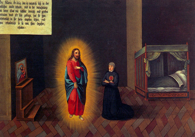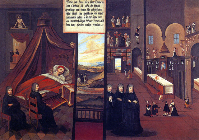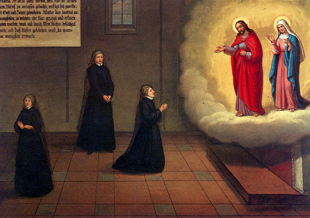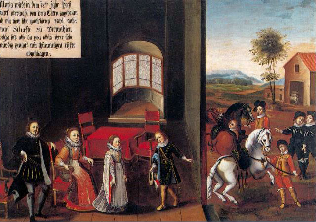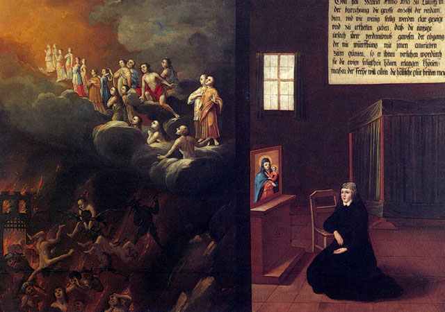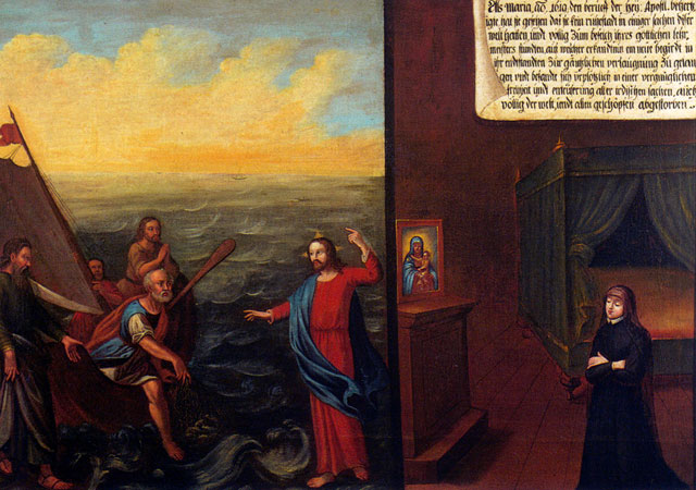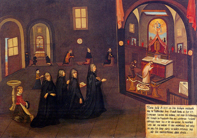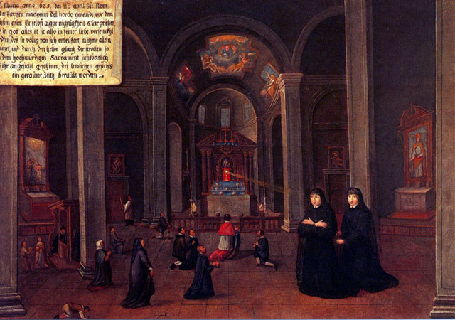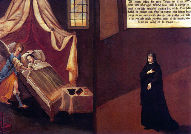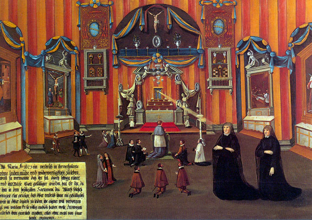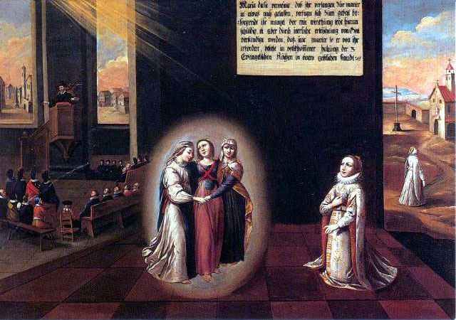 There are fifty paintings, each 142 x 105 cm, known as the ‘Painted Life of Mary Ward’ that show her spiritual journey. They are displayed in the ‘Mary Ward Hall’ in Augsburg in Germany. Very little information has come down to us as to the origins of the paintings. It is most probable that they were painted by various artists somewhere between Flanders and the Tyrol in the second half of the seventeenth century. There is written evidence that places them in Munich between 1680 and 1717, but how they came to Augsburg is unknown.